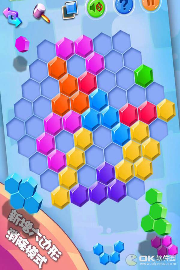 ·六边形消除:拖动六边形到棋盘空白处,排列完整的行列可以消除得分,当六边形组合无处摆放时,游戏结束;