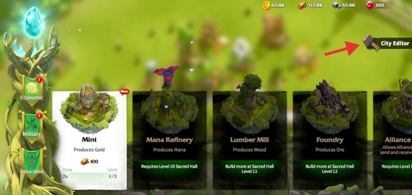 若要使用该功能,于您所在的城市界面中,点击左侧的锤子图标,它将引导您进入建筑菜单。在这个页面上,您会在屏幕右侧瞧见另一个小锤子图标,此图标被称作城市编辑器。