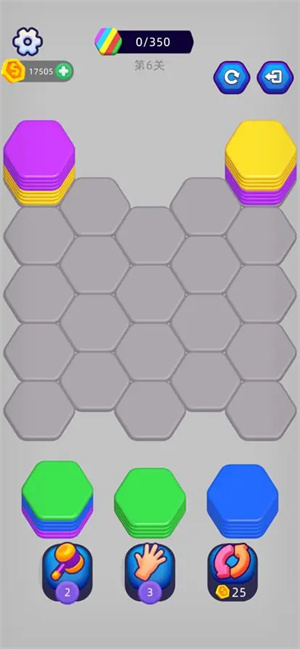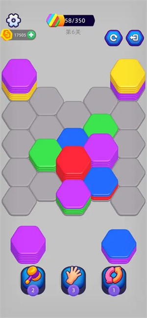 1、按颜色将六边形堆放在棋盘上,相同颜色的六边形瓷砖将分类到不同的位置并合并,非常的解压。