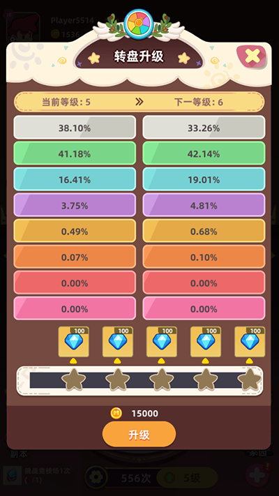 3、轮盘升级条件会越来越苛刻,开始我们升级轮盘只需要一个星星,后续轮盘等级提升后,我们升级轮盘就需要更多的星星,每次金币升级只能点亮一个星星,点亮所有星星即可完成当前轮盘的升级