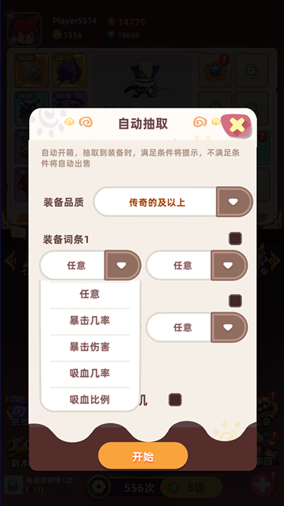 2、我们可以在自动抽取中设置装备品质(稀有度),装备词条(特殊属性),设置完毕后,即可正常开启自动抽取