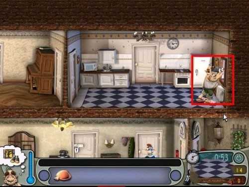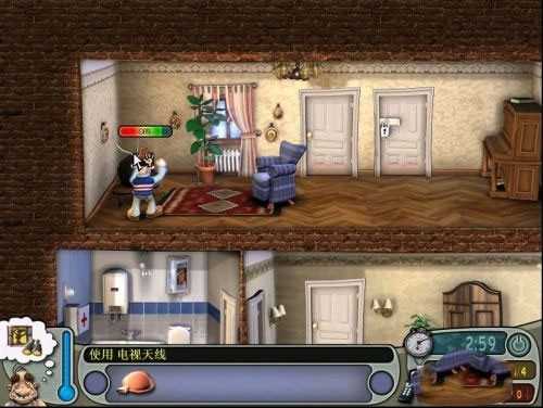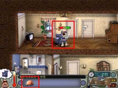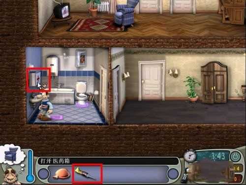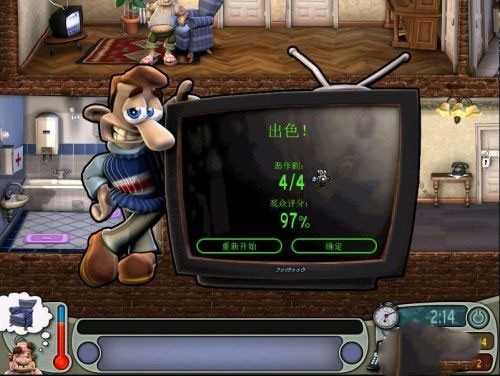 2、使用道具:泻药、鸡蛋、锯子、厕纸、电视机 顺序:厕纸+马桶→鸡蛋+微波炉→泻药+酒→弄电视机天线→躲进衣橱→老头跑到厕所后锯+沙发。