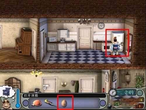 接着向右出发,从一层的门进入到二层的厨房,在右侧角落有个冰箱,从冰箱里边可以得到一个鸡蛋。