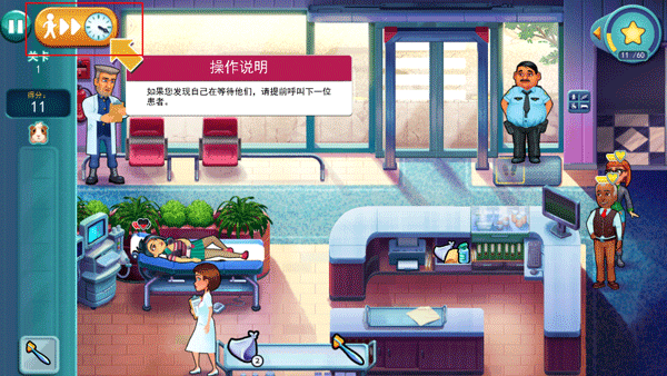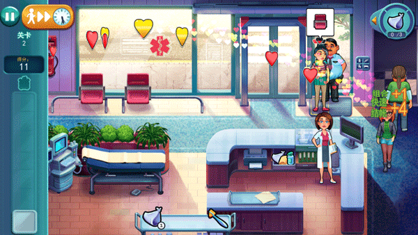快速分配患者将在您的分数上增加一份奖励。快速治疗患者可为您的患者增加额外的心。您可以快速完成一个动作以赢得更多奖励!