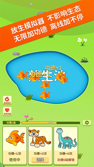 2、通过下方的进度条,您可以查看功德的升级进度和当前等级,随着功德提升,将解锁更多可供放生的动物种类。