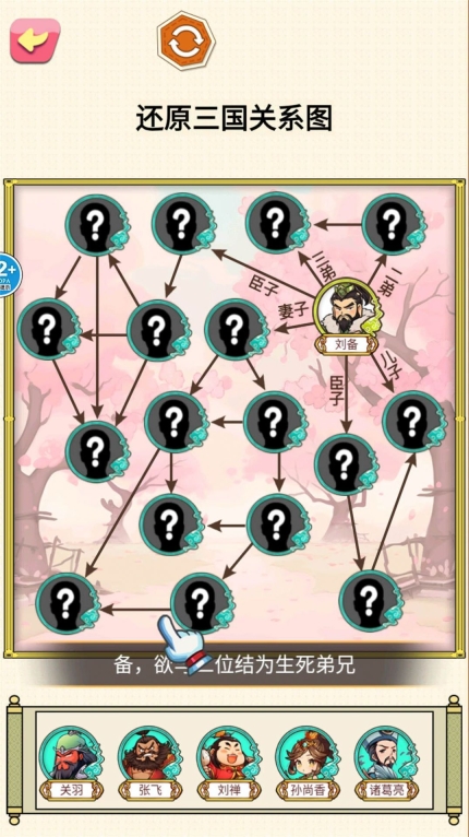 2、游戏会随机生成人物关系图,需要通过连线的方式将人物之间的关系梳理清楚;