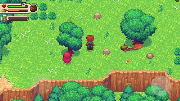 当我们没有武器时,路边的灌木丛会成为我们的障碍;而有了武器后,只需点击攻击键就能轻松摧毁它们。摧毁灌木丛后,有时会掉落恢复生命的红心或金币。屏幕左上角的绿色条代表生命值,下方的黄色条则是经验值,击败怪物可以获得大量经验,帮助角色升级。在森林中遇到宝箱时,记得面对宝箱并点击攻击键,这样就能打开宝箱获取物品。如果看到蓝色的光圈,一定要站上去,因为这是保存游戏进度的地方。每当玩家失败后,都可以从上次保存的位置重新开始。