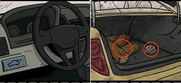 4、在后院拿走树根处的铁铲,然后到车库用其打开架子上的颜料罐拿到钥匙。