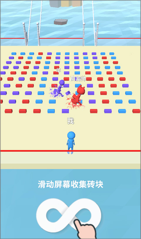 1、下载并安装搬砖争霸赛,启动游戏后,通过滑动屏幕来收集砖块,注意只能拾取与自己颜色一致的地砖。