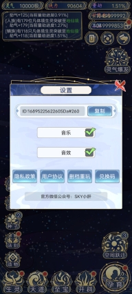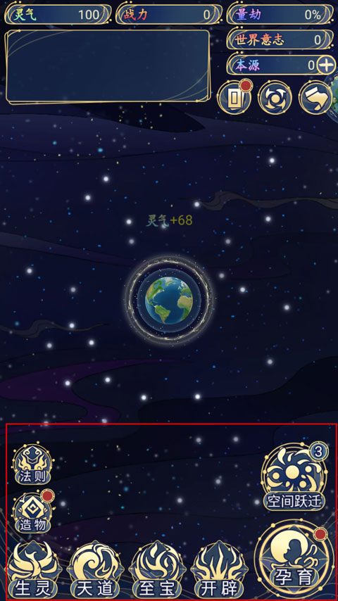 2、进入游戏如图,游戏主要包含法则、造物、生灵、天道、至宝、开辟、孕育以及空间跃迁玩法。