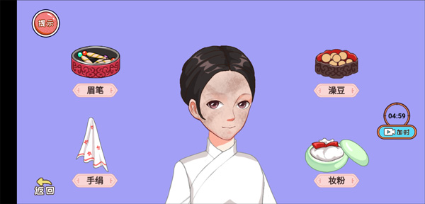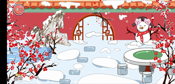 4、最后来到穿衣服环节,穿上左边那套蓝色的衣服与鞋子,从左上角挑选两款头发样式,戴上右边第二个头饰以及右边白色的围脖,最后把花瓶中的梅花插上,就能通关。