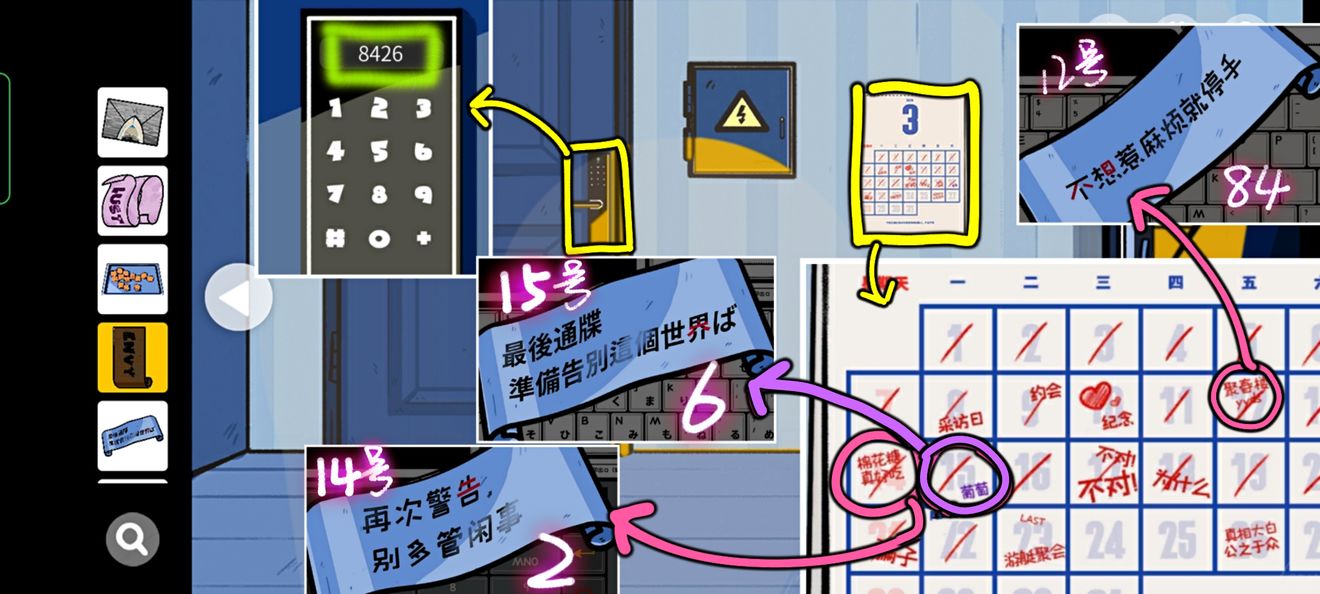9. 轻点查看门口日历,从中了解到《12号食用的是聚春楼外卖,14号吃的是棉花糖,15号吃的是葡萄》。据此,依据相应日期对纸条上的红字信息进行排序,进而得到《聚春楼84 - 棉花糖2 - 葡萄6》。接着,在门的电子锁上输入【8426】即可完成解锁。