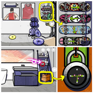 1.转到健身器材场景,点击右上角滑板,将所有滑板翻面,从上到下记住板面上的方向线索,《(东)右-左-下-右》。