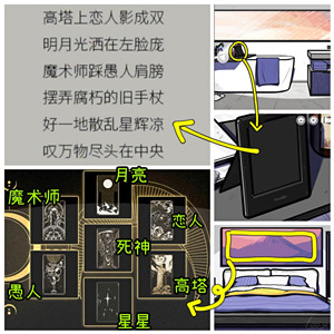 点击二楼卧室墙上的背景板,根据阅读器内的线索调整塔罗牌的位置。