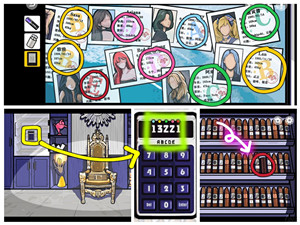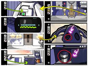 7. 在门口位置,找到相机陈列柜并点击,接着点击陈列柜第三层的相机,为其安装储存卡。之后点击箭头翻动照片,依据星空照片上呈现的线条,去解锁办公桌右侧墙上的键盘收纳柜。解锁密码按照九宫格数字排序为【4 - 5 - 2 - 3 - 6 - 9 - 8】 。