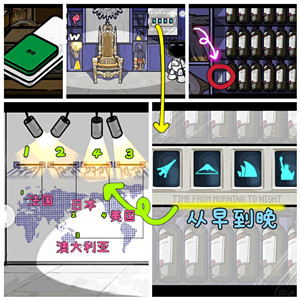 点击雕像场景左上角的射灯开灯,观察世界地图,找出射灯照出的时间与国家的对应关系。