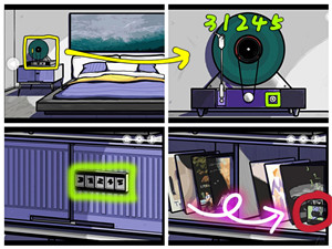 9. 找到卧室床左侧的留声机并点击它,接着点击唱针,此时会播放出一段让人听不懂的声音。然后点击箭头按钮,注意,箭头顺时针时,唱片会逆时针旋转,以此来更换唱片旋转方向。完成操作后重新播放,这时就能听到《31245》的声音。最后,点击留声机下方的柜子,在柜子的输入区域输入【31245】进行解锁,解锁后在柜子右下角就能拿到〔磁带〕。
