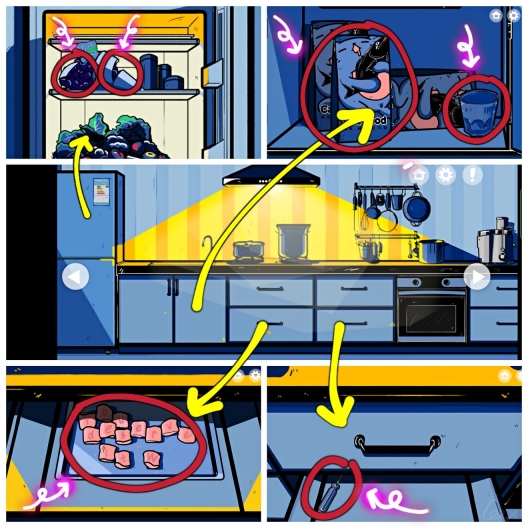 1.厨房,最左侧冰箱冷藏柜上层拿到〔葡萄〕和〔包装纸〕,水龙头下方的柜子里拿到〔猫粮〕和〔空杯〕,左列抽屉上层拿到〔棉花糖〕,右列抽屉下层拿到〔螺丝刀〕。