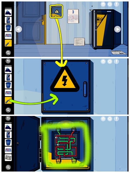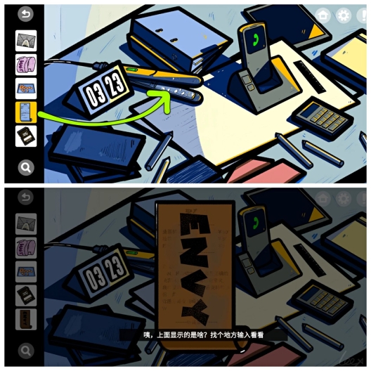 2.厨房右转,相机陈列柜上拿到〔邀请函〕。对门口的电箱使用螺丝刀,转动方块以连接电路。(接听电话)