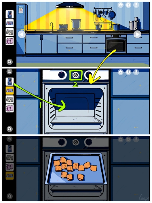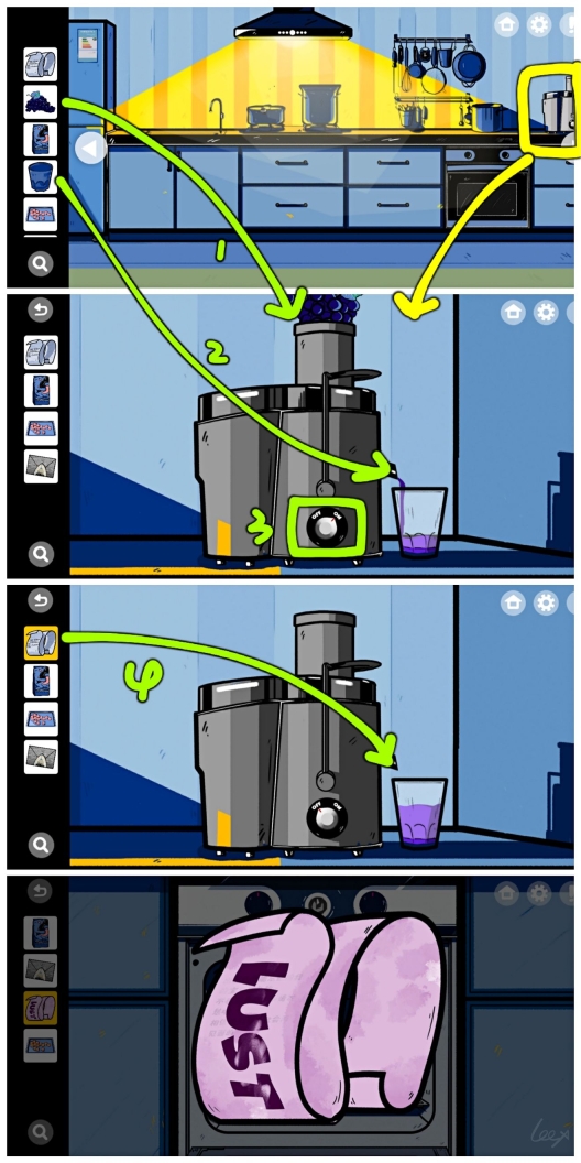 3.厨房,点击操作台上右侧的的榨汁机,将空杯放到右侧出汁嘴下,葡萄放到进料口,点击开关,榨出葡萄汁,对葡萄汁使用包装纸,包装纸变色,出现字母《LUST》。