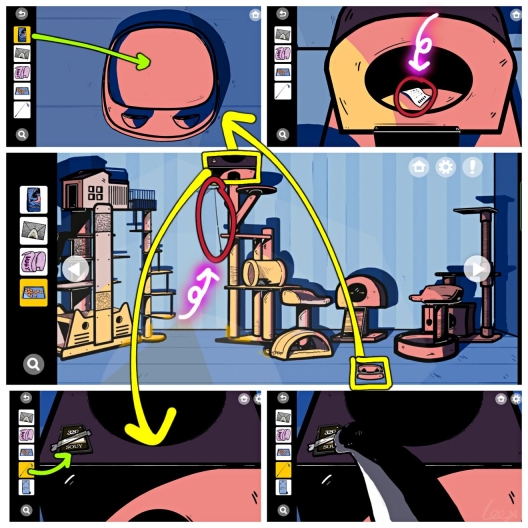 5.猫爬架场景,拿到架子上挂着的〔逗猫棒〕,食盆中倒入猫粮,猫咪从窝中跑出来,在猫窝中拿到〔聚春楼小票〕。
