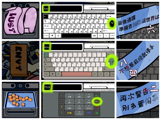 8.①葡萄包装纸LUST操作步骤:在第一行右侧的日文键盘上,点击输入【LUST回车】,之后会打印出纸条,仔细观察纸条上的红字部分,显示为《六》。(由于从葡萄包装纸上获取的信息表明葡萄来自日本,因此这里使用日文键盘进行操作。)