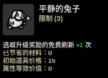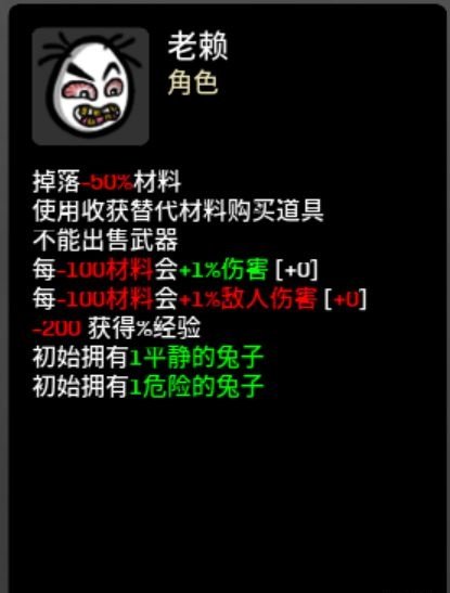老赖:使用收获代替材料购买道具,不能出售武器,初始拥有1平静的兔子、1危险的兔子。