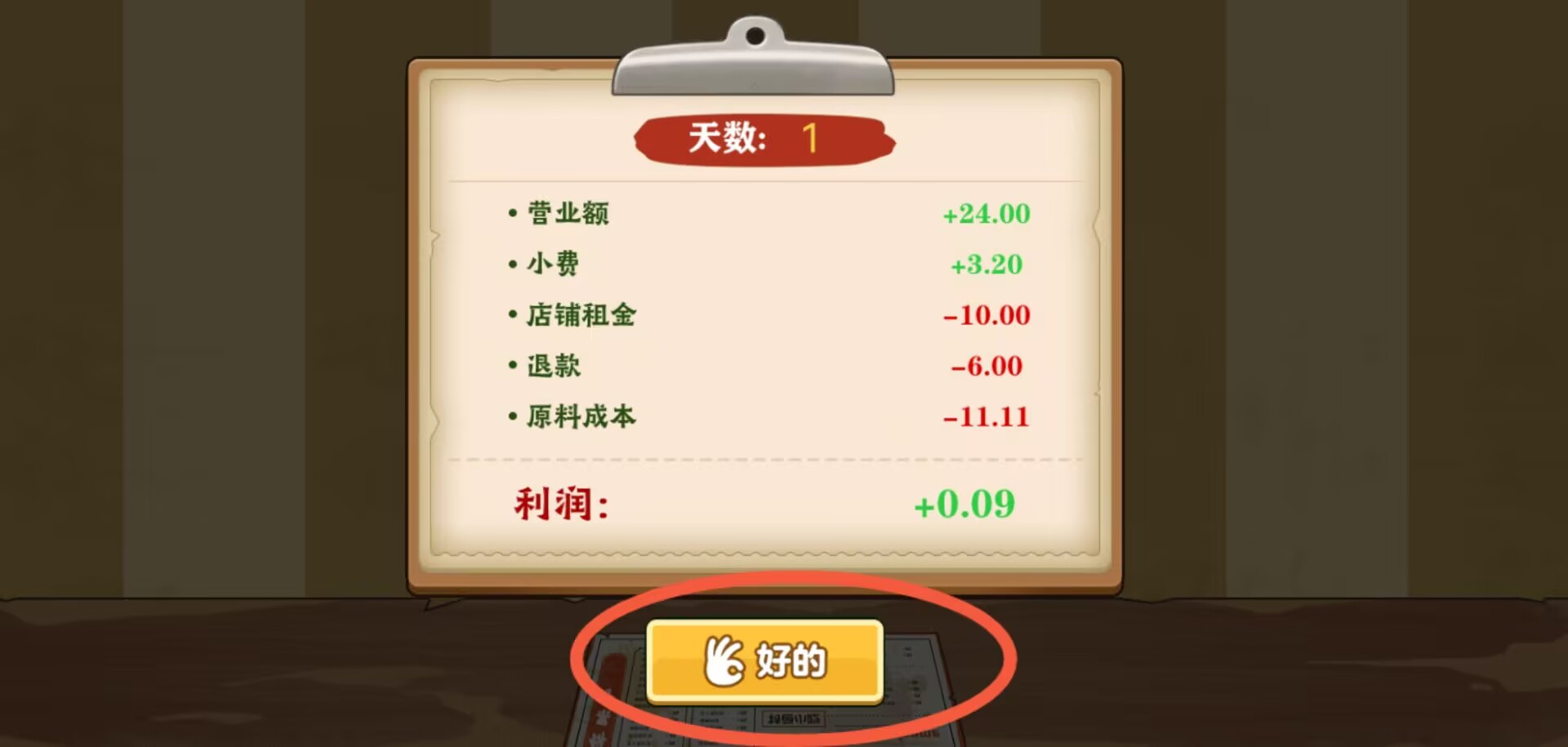 3、营业时间结束后,进入当日结算界面,该界面会详细呈现经营天数、总收入、各项支出以及最终净利润的数据统计情况。