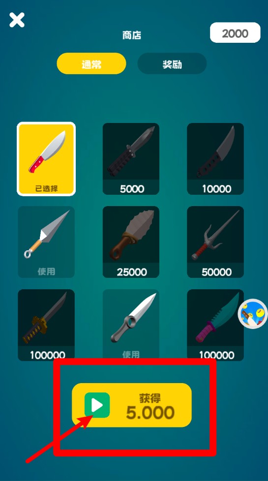 2. 刀具解锁途径:点击广告图标,即可获得5000金币奖励,这些金币能够用于解锁更多造型酷炫的全新刀具。