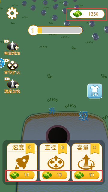 4、在升级板块,我们能够凭借积累的财富,点击升级按键,提高黑洞的速度、直径以及容量,进而使吞噬效率变得更高。