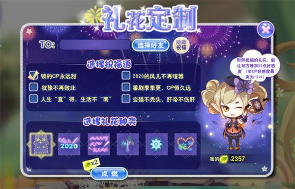 3、礼花定制:通过消耗神叶来定制礼花,把它赠送给你的好友们。这样不仅会有特殊通知,还能增加双方的好感度哟!