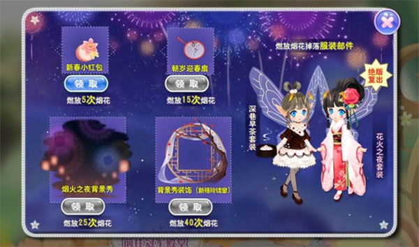 参与活动能够获取深巷早茶套装、花火之夜套装(绝版再现)、暗影花精灵王•玛格丽特、烟火之夜背景秀以及背景秀装饰——新禧玲珑窗。