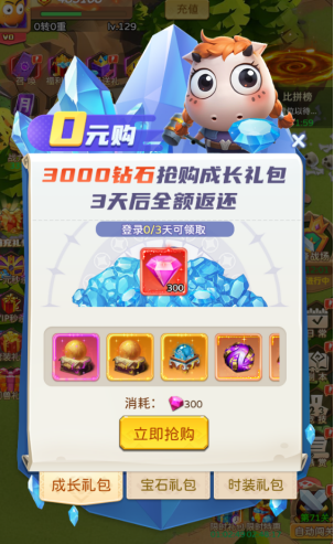 紧接着便是备受大家喜爱的【0元购】活动啦!只要您使用钻石购买【0元购】礼包,所花费的钻石将全额返还给您,购买的数量越多,返还的钻石也就越多。