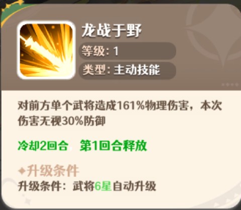 主动技能:龙战于野,释放出顶尖的单体输出能力,快速削减对手的战力!