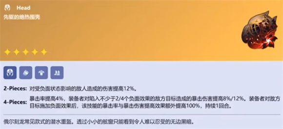 4四件套效果:暴击率提升4%。当装备者面对陷入至少2个或4个负面效果的敌方目标时,造成的暴击伤害分别提高8%与12% 。装备者给敌方施加负面效果后,该技能的暴击率与暴击伤害效果会额外提升100%,此提升效果持续一回合。