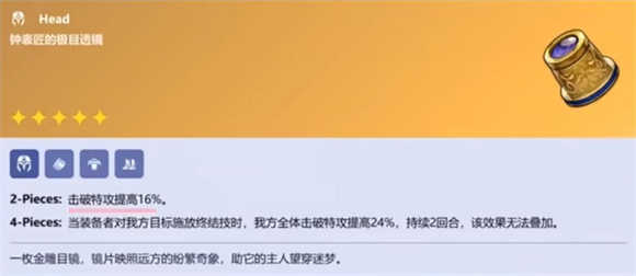4件套效果:当装备者对我方目标施展终结技时,我方全体的击破特攻提升24%,该效果持续2回合,且无法进行叠加。