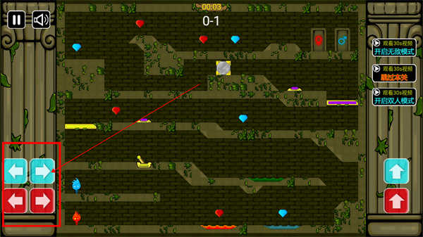 1、于单人模式中,左手负责分别操控冰火双人的左右移动方向。