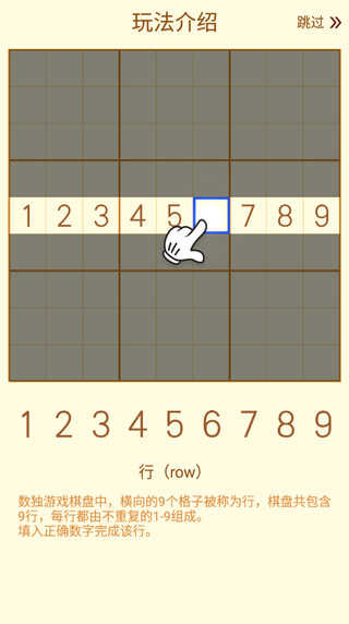 1在数独游戏的棋盘中,横向排列的9个格子称作行,整个棋盘一共有9行,并且每行的数字都是由不重复的1到9构成。