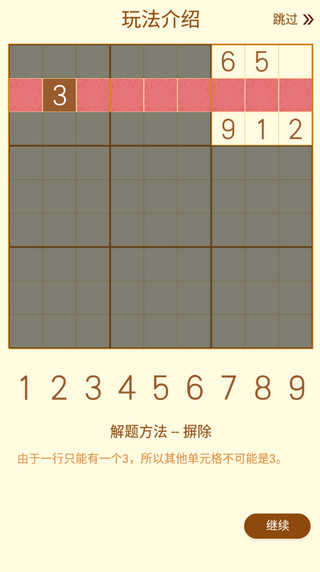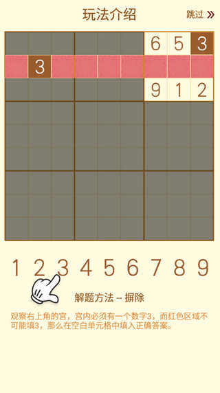 3、排除法:对各行列或九宫格进行观察,要是某个位置其他数字都无法填入,那就填入剩下的数字。