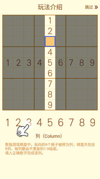 2、在数独游戏的棋盘中,纵向的9个格子称作列,整个棋盘一共有9列,并且每一列都是由1 - 9这九个不重复的数字组成。