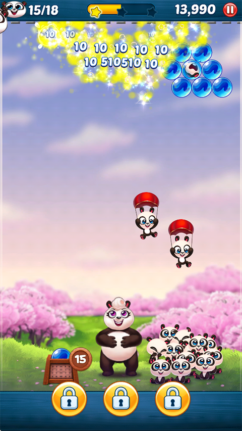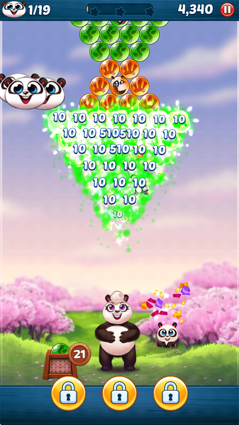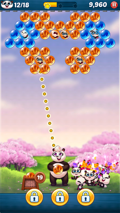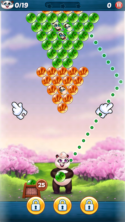 游戏的目的在于消除全部泡泡,成功解救被困于泡泡中的小熊猫。当屏幕上的泡泡被彻底清除,并且所有熊猫宝宝都得以获救,就能顺利通过关卡。