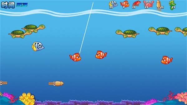 5、钓鱼的方法颇为简单,只需轻点屏幕,上方的鱼线便会向下伸展。当鱼线顶端恰好触碰到鱼时,就能把鱼钓起来。大家多尝试几次,就能轻松钓到鱼啦。