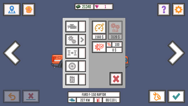 4、在此处能够对卡车的各类属性进行改造,像引擎、轮胎、耗油量等等。要知道,改装是会花费一定时间的,当然,你也能够选择用金币来缩减改装所需的时间。