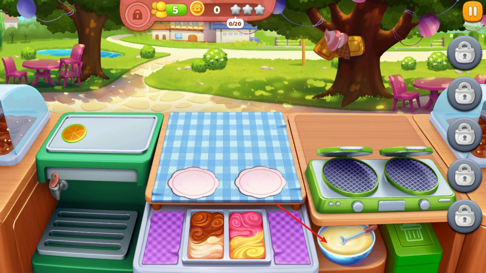2、接下来,让我们一同瞧瞧具体的操作步骤。初始的餐厅设定为冰淇淋店,第一步是点击面糊来制作蛋筒。