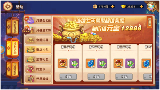 第二天:着重强化武将。具体方式为,通过参与过关斩将活动获取宝石,然后给武将装备这些宝石,持续将武将升级,直至当天资源耗尽。另外,充值豪华礼包与至尊礼包,不仅能够获取连续七天的奖励,还会额外得到月基金卡。