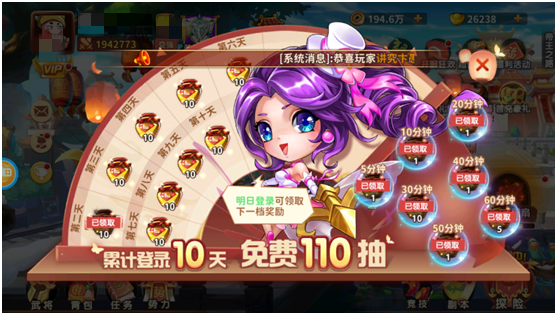 第一天:达成245分钟在线时长,即可领取20连抽。从第二天登录起至第十天,每天都赠送10连抽。完成开服狂欢的全部任务,在元宝购买处买下两样商品,完成22次点金可获取大量金币。通过完成任务的成就奖励,能得到诸多抽卡机会。抽到的卡牌,哪个国家的武将数量多就优先升级,后期若有强势武将再重点培养,前期先把能升为红色品质的武将升起来。{每天充值6元,可获得每日充值奖励及累计充值奖励}