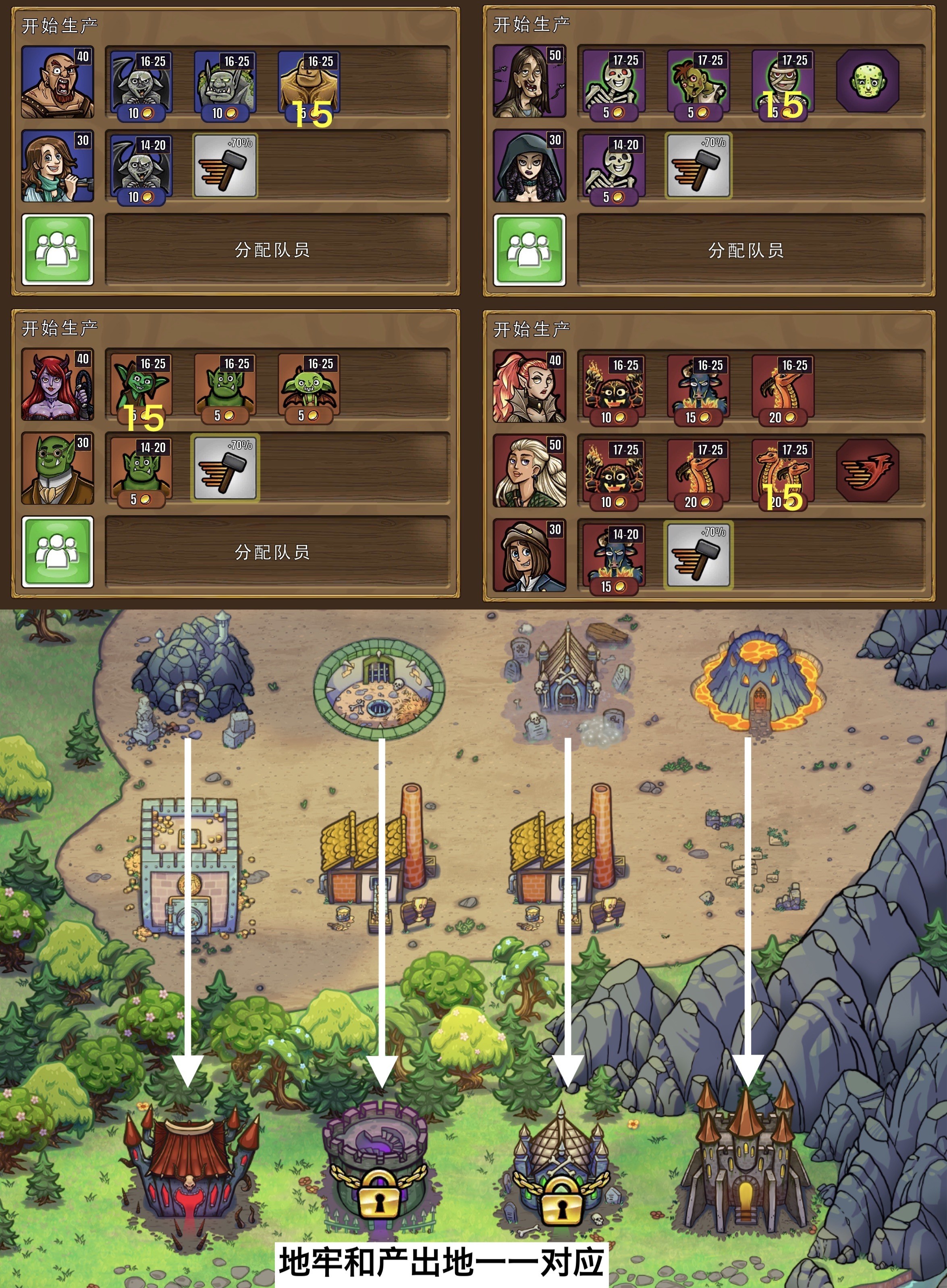 4. 地牢部分,目的是要英雄尽快离开,第二项特殊功能必定是增加英雄伤害,第五项特殊功能不做任务必定是破坏盔甲(搭配防具店骷髅怪,方便英雄买完盔甲直接润)。一般我只开放黑暗神殿(放双头龙烧伤)和恶魔的城堡(放石巨人骨折)。做宝箱声誉、拿多个战利品、打多只怪、染病任务锁黑暗和恶魔,开老地牢和地穴(老地牢放地精也是为了让英雄尽快打完润。注意,怪物声誉任务其实还是黑暗和恶魔搭配好)