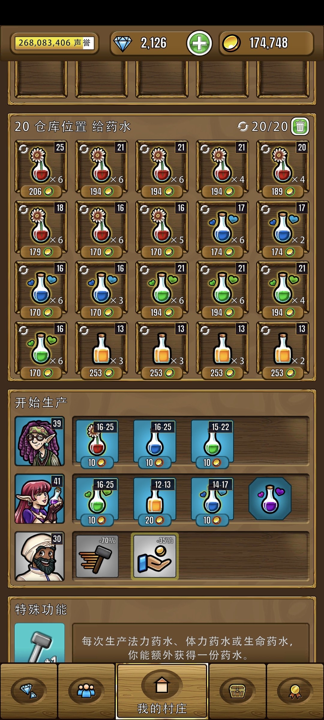 接下来是药水,为了加快效率,我们尽量把4个种类的药水都放在同一个房子里,防止英雄买了红药水,要跑出去买蓝药水的情况,同时我们要把效率和利润拉满,药水的制作时间非常短并且数量多,因此不需要减少制作时间