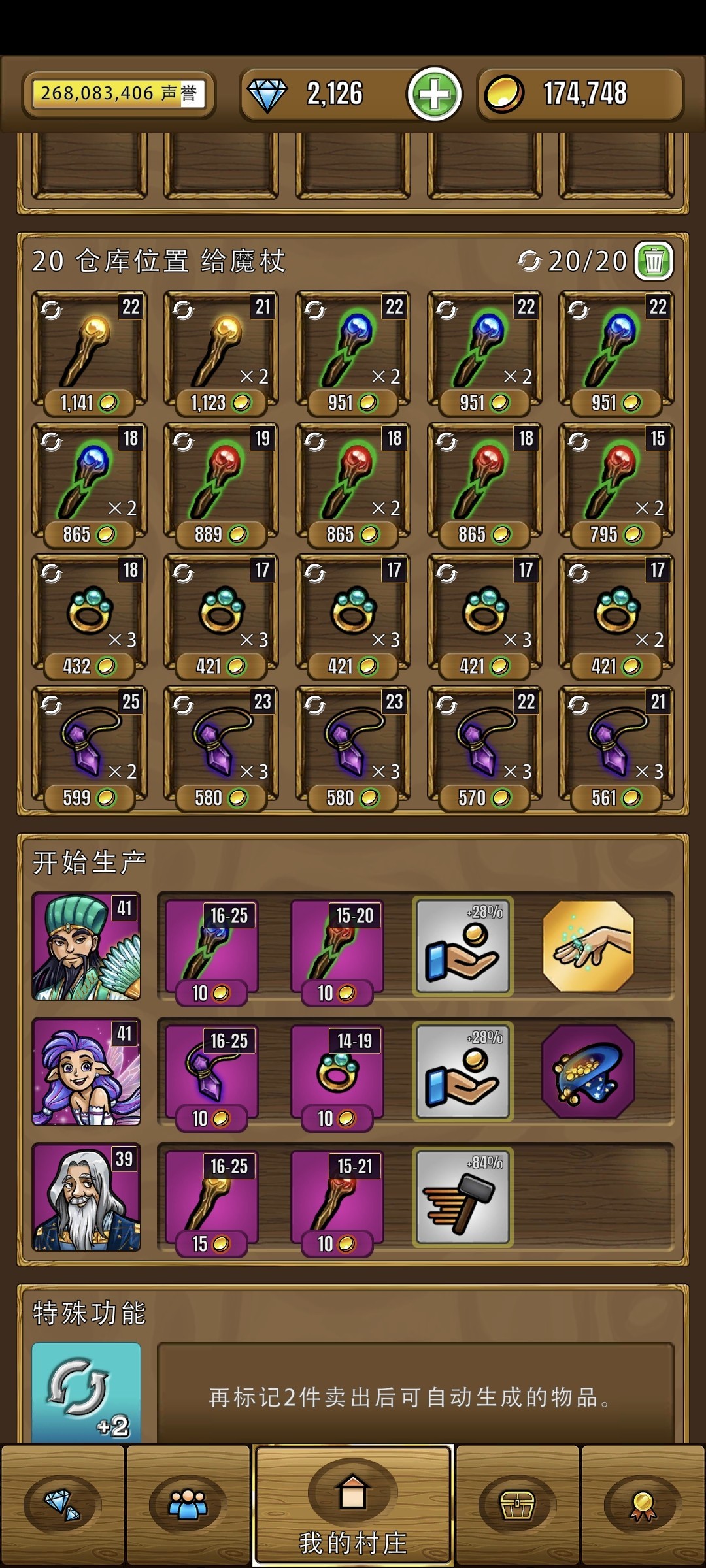 没什么好说的,一个够用。个人不喜欢被诅咒的弗洛多,概率实在低。闪电法杖全看个人爱好吧,我放着是因为做任务,还有这配置下闪电法杖能卖1200~1400,普通法杖1000~1200,一来一去,最终收益带闪电法杖和换上加金币收益的店员感觉差不多(还能省一个金币收益店员给别的地方)。