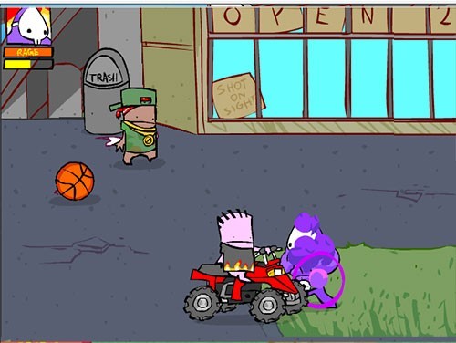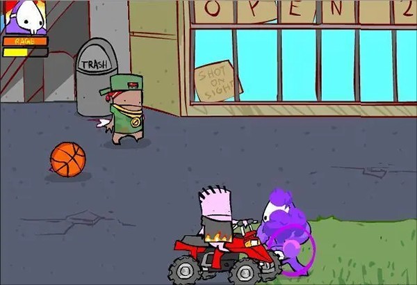 快看呀,有两个小孩开车过来啦!要是被车撞到,可是会伤血的!咱们可以用篮球把车打爆,或者利用上方的垃圾桶,也能用风车拳来应对。这里要提醒一下哦,狠狠地狂扁那个垃圾桶,能提高爆气的概率呢。